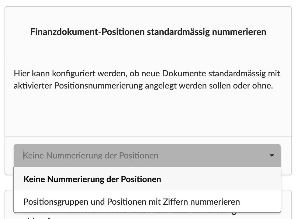 Unter Einstellungen > Finanzen kann nun vorgegeben werden, ob künftige Finanzdokumente wie etwa Kostenvoranschläge und Ausgangsrechnungen eine Positionsnummerierung haben sollen oder nicht.